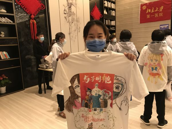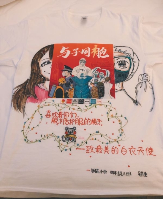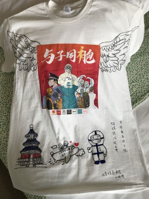 徐敬阳介绍,他给每位医护人员准备了两件文化衫,正面都印有专门设计的“与子同袍”的字样和医护等战“疫”一线人物群像图案,“一件可以经常穿,另一件因为有涂鸦,不能洗,可以留作纪念。”