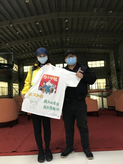 3月10日,徐敬阳和临空港抗疫联盟的志愿者胡玉龙、叶海涛、小雪一起驱车将首批文化衫分别送到河北、北京、天津医疗队队员的驻地。