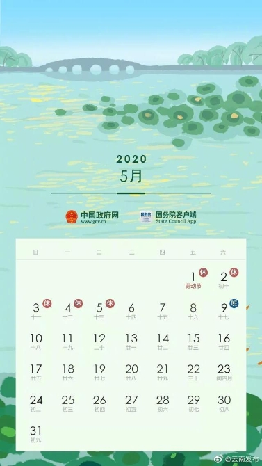 昆明信息港讯 机器人小明 2020年清明节、劳动节、端午节、国庆节和中秋节放假调休日期的具体安排通知如下。