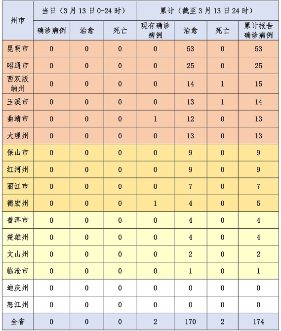各州市累计确诊病例:昆明市53例(治愈出院53例),昭通市25例(治愈出院25例),西双版纳州15例(治愈出院14例、死亡1例),玉溪市14例(治愈出院13例、死亡1例),曲靖市13例(治愈出院12例),大理州13例(治愈出院13例),保山市9例(治愈出院9例),红河州9例(治愈出院9例),丽江市7例(治愈出院7例),德宏州5例(治愈出院4例),普洱市4例(治愈出院4例),楚雄州4例(治愈出院4例),文山州2例(治愈出院2例),临沧市1例(治愈出院1例)。