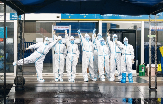 2020年3月10日,随着武昌方舱医院的医护人员送走最后一批康复出院的新冠肺炎轻症患者,武汉市方舱医院全部完成使命,宣布休舱。图为江汉方舱医院的医疗队员出舱后合影。新华社 记者 费茂华/摄