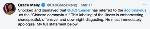 美国民主党籍国会众议员孟昭文要求麦卡锡道歉,并指责他的这一举动是“寻找替罪羊和政治权宜伎俩”。她说:“给疾病贴标签令人蒙羞、粗鲁无礼、令人作呕,这非常无耻。”
