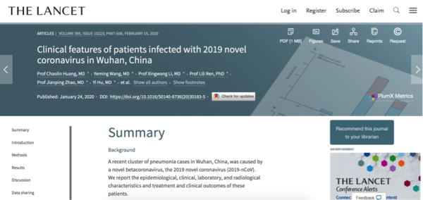 1月24日,《柳叶刀》网络版发表了一篇由武汉市金银潭医院黄朝林等7名临床医生参与的《中国武汉2019新型冠状病毒感染者的临床特征》研究论文,论文的研究对象是最初被收治的41例新冠肺炎病例。研究显示,首名感染新型冠状病毒患者出现症状的日期是2019年12月1日,该病例无华南海鲜市场暴露史,其家人也未出现发热和呼吸道症状。