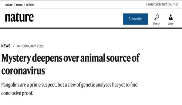2月26日《自然》杂志发布一篇题为《新冠病毒的动物来源说法仍迷雾重重》的文章。文章指出,穿山甲有可能是中间宿主,但从大量的遗传学分析角度尚未找到确凿的证据作支撑。