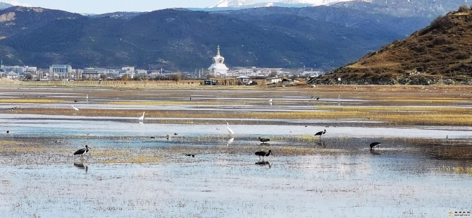 3月14日,记者看到黑颈鹤、黑鹳、斑头雁、白鹭、海鸥等尚未迁徙的候鸟,成群结队在纳帕海湿地中栖息觅食,香格里拉市民也到湖边来喂海鸥。近年来,香格里拉市通过生态补偿争取当地民众支持,积极整治周边水环境,使湿地生态环境得到修复,冬季候鸟种群与数量也在逐年增加。