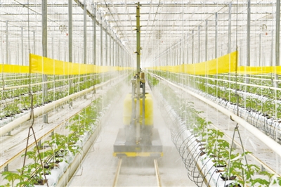 初春时节,山西农业大学为山西省晋中市太谷区范村镇格子头村引进自动喷药机、病虫害物理防治系统、水肥一体化系统,有效提高了生产效率,帮助农民增收致富。图为近日,自动喷药机在格子头村的玻璃温室大棚内为西红柿苗喷洒农药。新华社 记者曹阳/摄