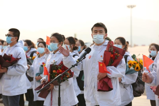 “我和我的祖国,一刻也不能分割……”歌声进入高潮,乘务员们把早已把准备好的来自公司不同岗位员工手写的爱心贺卡交到每一位“英雄”手中,“这是我人生中最有意义的一次‘回家’,感谢家乡人来接我们,给我们一路上带来温暖!”医护人员们纷纷与乘务员合影留念。