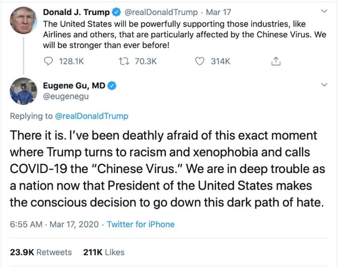 在美国社交网络上粉丝众多的华裔医生顾优静发帖说,他最担忧的事情发生了,在美国面临巨大危机之时,政界人士转向种族主义和仇外心理,把新冠病毒贴上中国标签,选择了走向仇恨的至暗之路。