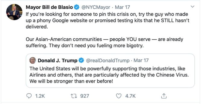 纽约市长白思豪发帖说,美国目前面临的这场危机该由谁来负责?应该怪的就是那个承诺要提供新冠病毒检测试剂盒却未兑现的人。他说,美国的亚裔社区正在遭受疫情影响,他们最不需要的就是你来煽动偏见。