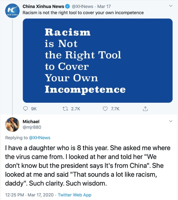这件事其实连8岁的小孩都看得清楚。一名叫“迈克尔”的网友在网上留言说:我8岁的女儿问我,病毒从哪来。我告诉她:“我们不知道,但总统说是中国来的”。我女儿看着我说道:“爸爸,那听起来非常种族主义。”真是头脑清楚又聪明。
