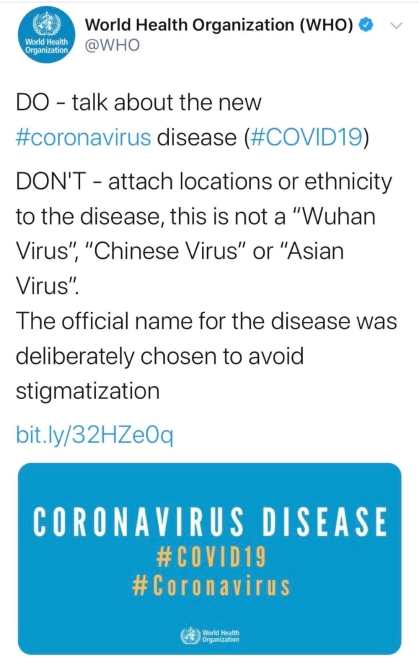 关于新冠肺炎的命名,世卫组织早在3月3日就已指出,新型冠状病毒感染的肺炎命名为“COVID-19”,反对将病毒同特定国家和地区相联系,反对搞污名化。