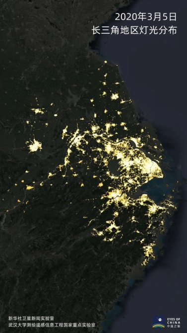 这是长三角地区3月5日较2月初,夜间灯光亮度增加情况,黄色越明亮,亮度增加越多。