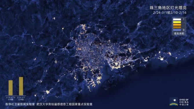 这是珠三角2月底较2月中旬的夜间灯光亮度增加情况,黄色越明亮,亮度增加越多。