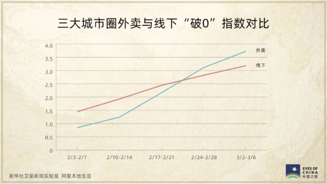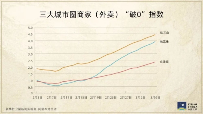“破0”指数,是根据商家恢复营业获得首笔收入、复工后的持续营业时间等计算得出,这两张图呈现出,在三大城市圈,复工复产并获得收入的商家不断增多。