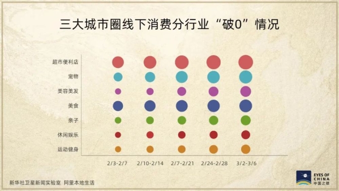 超市便利店、美食餐饮在整个2月都保持着稳定的复工趋势。随着疫情防控稳步推进,休闲娱乐等行业的“破0”商家越来越多。