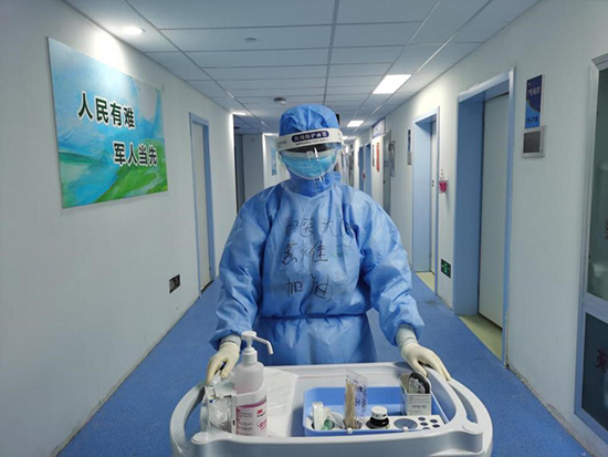 到武汉我被分配在湖北省妇幼保健院光谷院区感染二科,这是一个危重病区,收治的大部分都是老年患者。刚到武汉的第二天,我护理一位耄耋之年的老爷爷,在打针时,他随口说了一句有没有凳子,站着吃饭很费力。打完针,我就急忙给他找了个凳子送过去。老爷爷说自己是个退伍老兵,说完郑重其事地站起来向我敬了一个军礼。那一刻,我不由自主地站直了身子,握紧了右拳,心中默念:“加油!”那一刻,我觉得我全身每一颗细胞都热血沸腾!