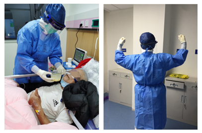 记得刚开始穿防护服进病房,小伙伴们紧张害怕,紧张自己的防护服是否严密包裹自己,是否有任何暴露的风险。害怕的是,因为是第一次接收病人,能否合理安排好工作秩序,能否可以和病人顺利交流等诸多问题。随着时间的推移,在摸索中一步步前进,转眼间,一个月快过去了,我们已经适应了穿防护服的日子,适应了每天过的跟打仗似的日子。