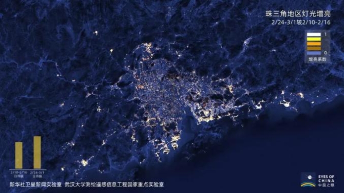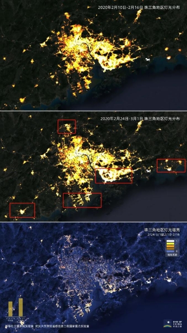 这是珠三角2月底较2月中旬的夜间灯光亮度增加情况,黄色越明亮,亮度增加越多