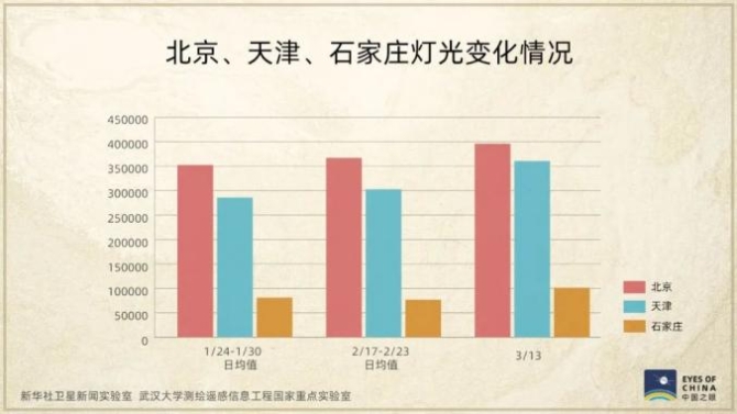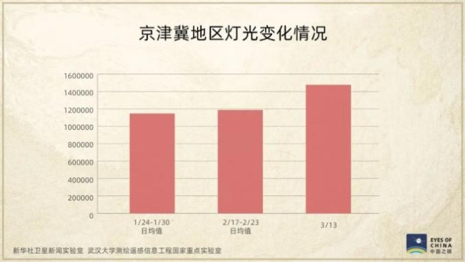这是春节期间至3月13日,京津冀地区夜间灯光亮度变化情况,2月下旬起亮度出现提升