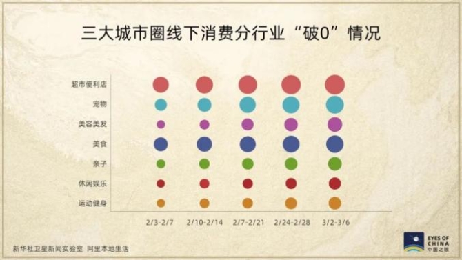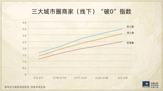 “破0”指数,是根据商家恢复营业获得首笔收入、复工后的持续营业时间等计算得出,这两张图呈现出,在三大城市圈,复工复产并获得收入的商家不断增多。