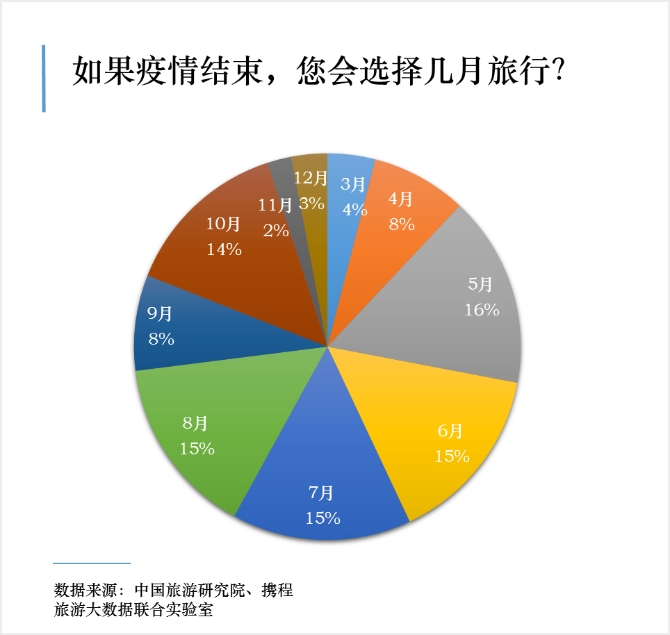 报告显示,上半年以及全年的旅游意愿都比较高,预计从五一假期开始出现旅游高峰。有近一半(43%)被调查者表示,如果疫情结束,会选择在2020年3到6月上半年旅游。4月份旅游意愿是3月份的2倍,选择5月旅游的比例达到16%,位居全年各月之首。其次是6、7、8三个月,各有15%的选择率。国庆假期的10月预计也是旅游高峰,有14%的选择比例。
