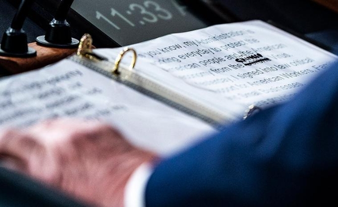 19日,美国总统特朗普在白宫新闻发布会上的讲稿被记者拍下。照片显示,稿件中的“新冠病毒”被划掉,手写改为了“中国病毒”。