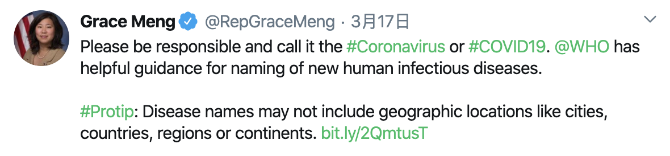 纽约州民主党议员孟昭文:希望政界人士负起责任,不给新冠病毒贴标签。世卫组织对传染病的命名有指导规则,不能包括城市、国家、地区或大洲等地理位置。