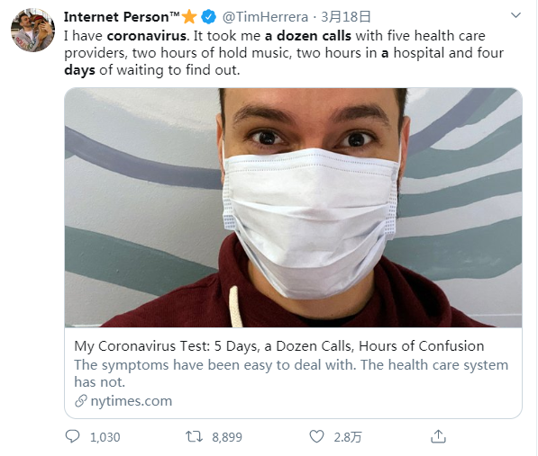 《纽约时报》33岁生活版编辑蒂姆·埃雷拉发文称确诊新冠肺炎。蒂姆表示,自己在发烧咳嗽后询问医生,如何才能接受核酸检测?结果被告知自己去网上搜索。随后他自己联络医院和疾控中心,被通知需自行前往医院检查。