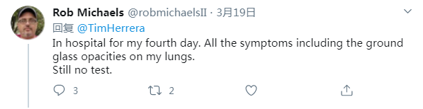 网友Rob Michaels:这是我在医院的第四天。我的肺部出现了(新冠肺炎的)所有症状,包括毛玻璃结节。仍然没有继续测试。