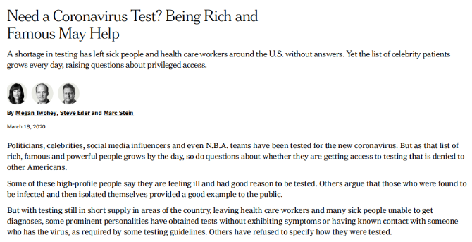 18日,《纽约时报》撰文指出,在美国的富人和名人更容易优先接受检测。