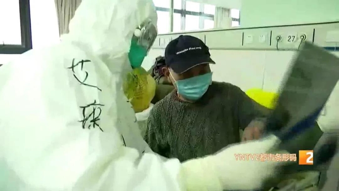云南省援助湖北省第五批医疗队医生 艾琼:“现在他精神好转,咳嗽也好多了。他刚来的时候,你看他的整个肺的病变是比较重的,然后后来我们给他治疗以后复查,这些浅淡了都吸收了,而且这些好转特别的明显。他现在核酸检测已经是阳性,符合出院标准,所以我们今天打算给他出院的。”