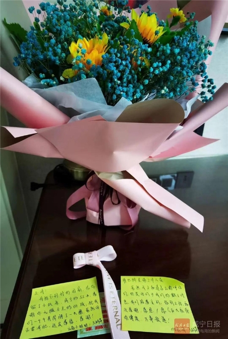 “玉哥,我怕分别时的泪崩,给你留了小纸条。咸宁的55天,感谢你无微不至地照顾,把我们一个个养得胖了一大圈。虽然回去要减肥,还是感恩、感谢!”
