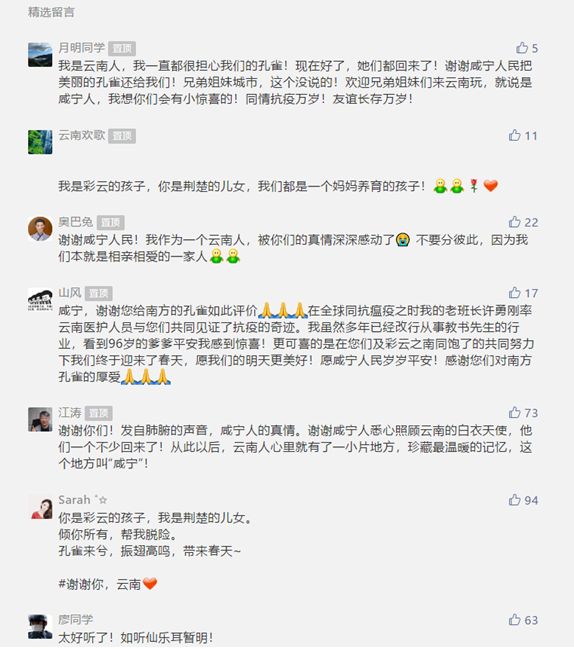 咸宁网友留言称:听着听着,泪眼婆娑!孔雀来兮,不离不弃!感恩天使!感恩云南!爱你们!来自咱彩云之南的白衣天使们!你们是逆行中美极了的金孔雀!