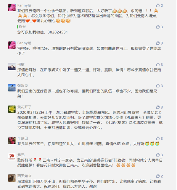 近日,一首由咸宁音乐人创作,致敬云南援咸宁医疗队和云南人民的歌曲《孔雀来兮》在网上传播,经云南网报道后,有更多人关注和收听该曲,并纷纷留言点赞。短短两天时间,首发微信“咸宁的声音”上已经有2.3万人收听此歌曲,评论近80条,成为云南、咸宁两地共抗疫、情守望相助、相亲相爱的生动写照。