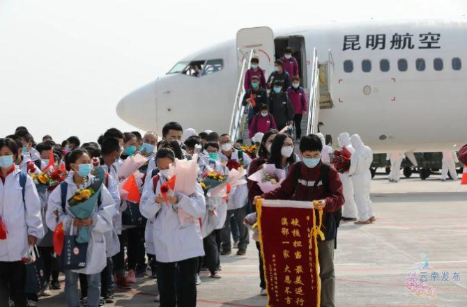 3月18日,云南援助湖北医疗队首批返程队员从武汉启程返回云南。