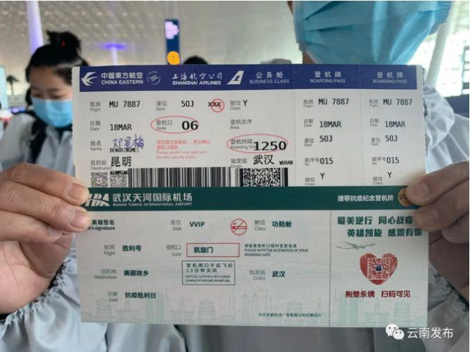 3月18日,天河机场为返程的医疗队队员们精心准备了“限量版”纪念机票,这张机票是他们这趟不平凡旅程的见证。