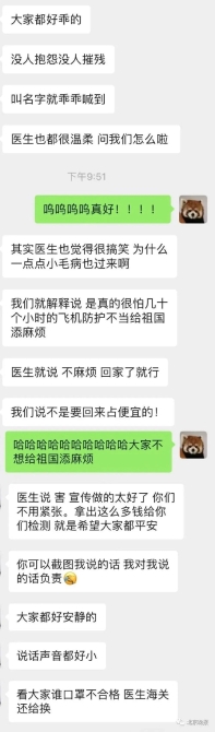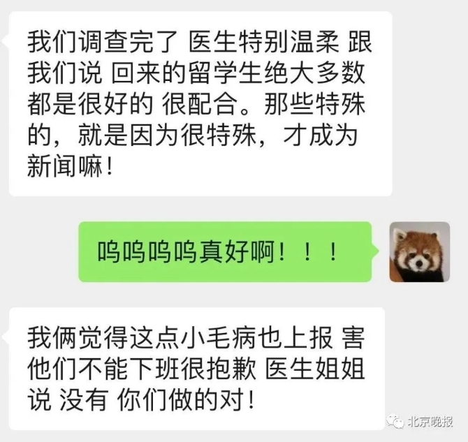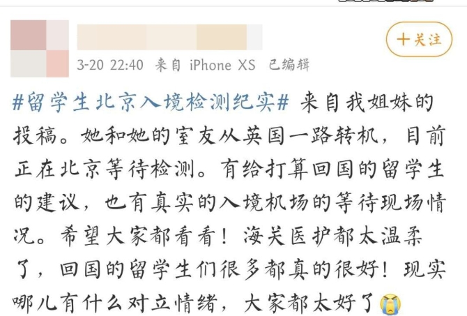 微博@浪里赤条小粗林:#留学生北京入境检测纪实# 来自我姐妹的投稿。她和她的室友从英国一路转机,目前正在北京等待检测。有给打算回国的留学生的建议,也有真实的入境机场的等待现场情况。希望大家都看看!海关医护都太温柔了,回国的留学生们很多都真的很好!现实哪儿有什么对立情绪,大家都太好了。