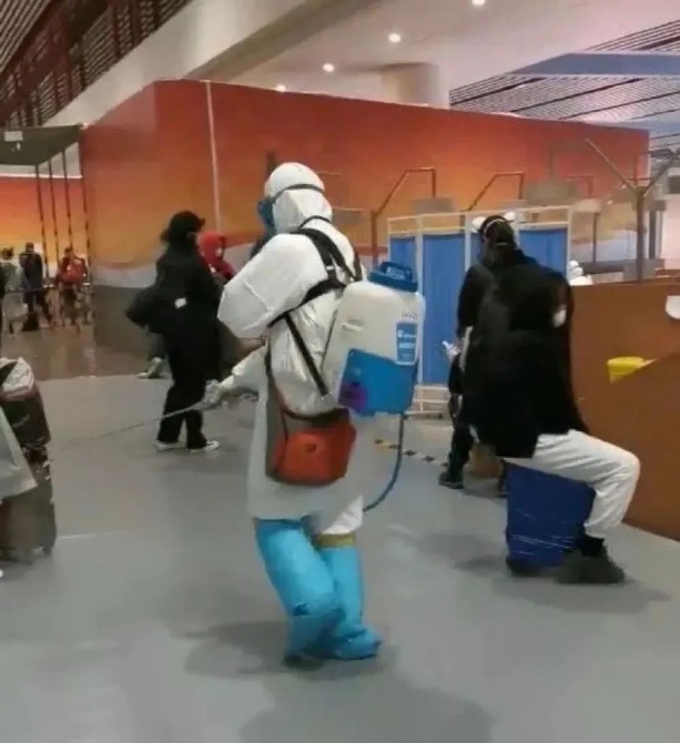 3、工作人员走来走去消毒。看大家谁口罩不合格 ,医生海关还给换。视频里好几个医护围着给一个小宝宝温柔的换口罩!我姐妹说“托祖国福,我们第一次有了n95。”