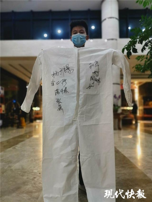 " 其实他们都比我大,叫我强哥都不敢应。" 陈强腼腆地笑着。陈强还展示了一件特殊的防护服,上面写满了他接送的医护人员名字。" 我希望即使他们走了,我也能记得他们。"