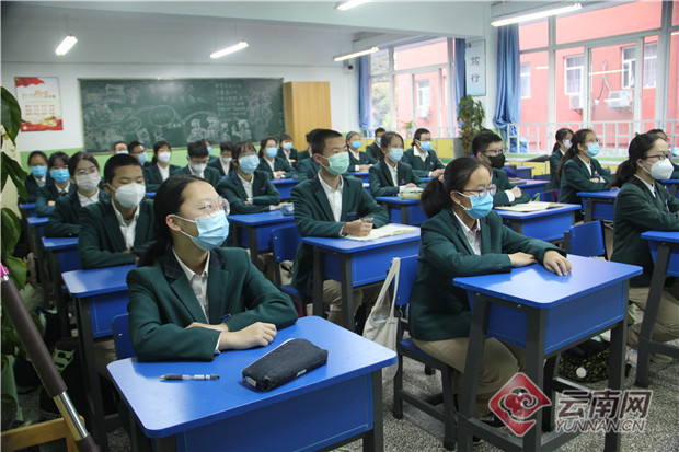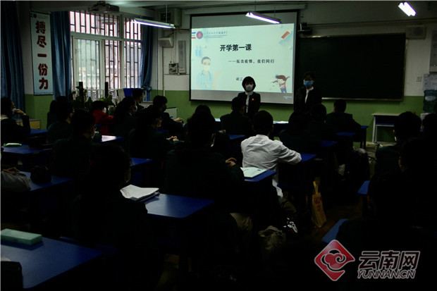与此同时,昆明市第十中学初三年级的学生们也正在上“开学第一课”,老师们把授课重点放在了新冠肺炎及其自我防护等内容上。通过PPT、小视频、图片等形式多样的手段,同学们纷纷站起来分享了自己在疫情期间的感受和认识。