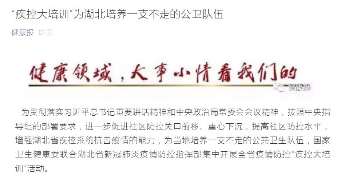 按照中央指导组的部署要求,进一步促进社区防控关口前移、重心下沉,提高社区防控水平,增强湖北省疾控系统抗击疫情的能力,为当地培养一支不走的公共卫生队伍,国家卫生健康委联合湖北省新冠肺炎疫情防控指挥部集中开展全省疫情防控“疾控大培训”活动。