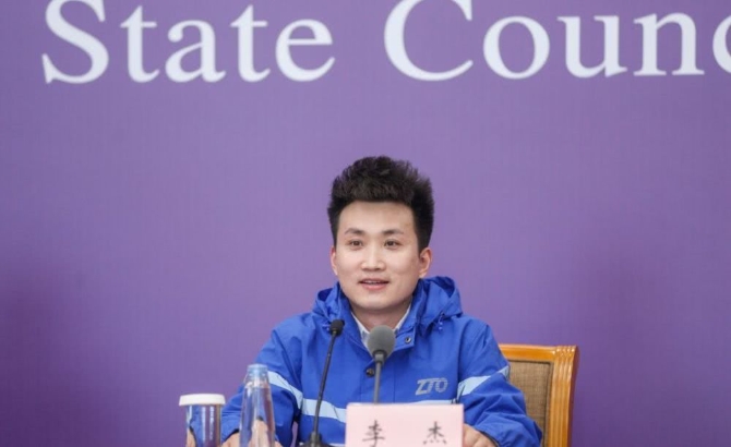 3月9日,中通快递北京厂洼路网点快递员李杰在北京出席国务院联防联控机制新闻发布会。新华社记者 张玉薇 摄