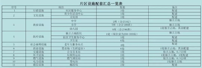 规划形成3处社区服务中心、1处青少年活动中心、1处文化馆,独立占地医院1处,社区卫生服务中心1处,卫生室6处,老年人服务站点4处,菜市场6处,公交首末站1处,垃圾转运站2处,燃气调压站1处,变电站2处,邮政局2处,具体详见下表: