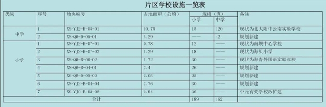 片区范围内共将布局小学189班、中学162班,片区内将形成2所中学、7所小学。具体班数、规模与地块详见下表: