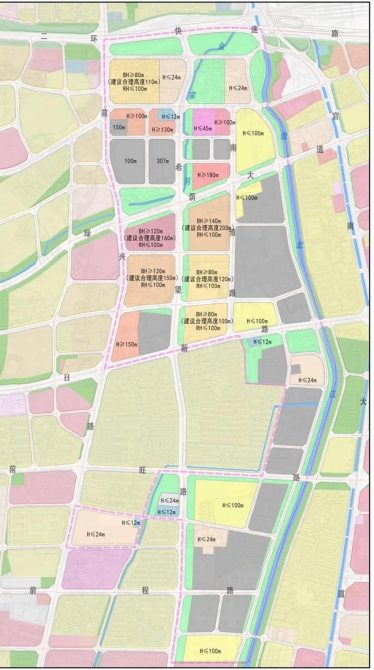 片区以地标性建筑物昆明万达双塔为控制,双塔周边新建建筑建议合理高度控制在200米以内,其余建筑呈现由双塔向外围逐步降低的城市意象。
