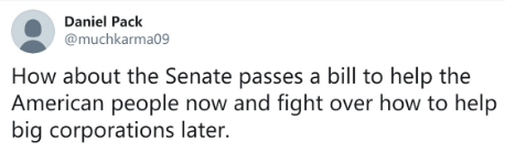 参议院两党就不能先通过一个能帮助美国人民的协议然后再为如何帮助大企业干架。