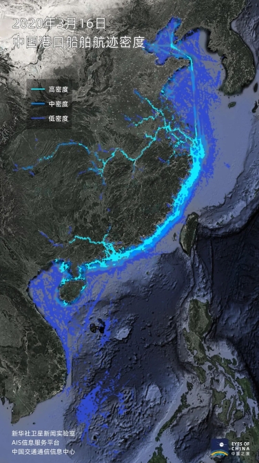 根据通信卫星等方式获得的船舶信息, 中国沿海及内河的船舶活跃度正在快速提升。