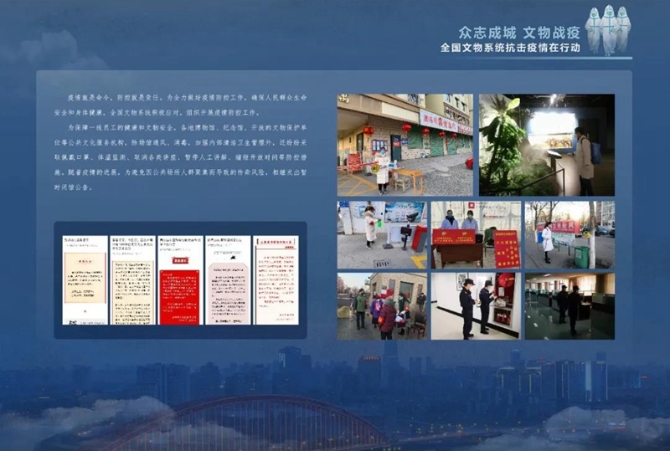 闭馆不闭展、温情不打烊、文物系荆楚、祝福颂祖国……回望文物系统在疫情防控阻击战中的作为与担当,点点滴滴,汇聚成“众志成城文物战疫——全国文物系统抗击疫情在行动”展览。