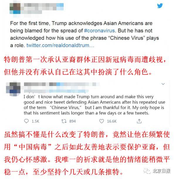 3月23日,特朗普曾推特呼吁保护亚裔群体,他表示新冠病毒不是亚裔美国公民的错,他们是很棒的人。