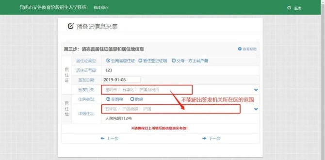 注意:居住地所属县区和居住证(或主城户籍)签发机关所属县区应该一致。(如:居住证签发机关或父母一方户口所属五华区,那么在选择居住地片区时就只能选择五华区辖区内的街道和社区)。